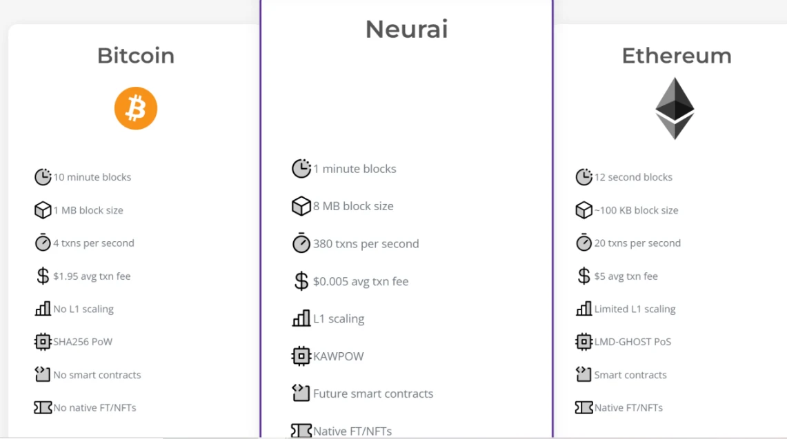 Neurai 的目标是创建一个利用人工智能算法的综合平台。借助人工智能的力量,它可以进行数据分析、预测建模、决策,并将区块链资产连接到物联网设备。与比特币和以太坊相比,Neurai的主要技术参数如下: