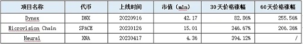 从上表可以看出,这些项目上线时间不足一年,市值均不足5000万美元。他们在过去两个月里实现了良好的价格上涨。
