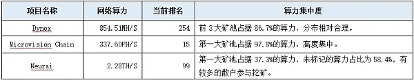 总体来看,Dynex在GPU算力方面具有优势,且算力不断增强。不过,由于算法升级,其算力近期有所下降,但预计未来会逐渐恢复。另外,KAS现在转向使用专业矿机,之前的GPU算力正在参与DNX挖矿,进一步提升DNX的算力。Microvision Chain算力排名较高,但中心化程度较高,算力呈波动趋势。Neurai有众多个体矿工参与挖矿,去中心化程度高,算力不断增强。