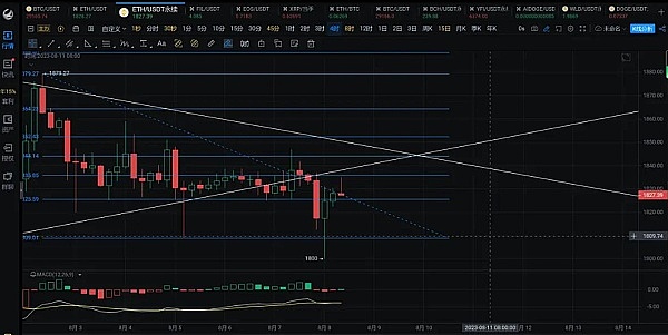 以太坊行情分析:昨晚行情再次回踩周线60日均线获得支撑反弹,周线走出三连阴,上方压制依然很重,下方仍有继续去测试支持的趋势,而从技术层面上看,RSI有稍稍拐头的趋势,但仍处于一个放量下跌的趋势,那么就要继续去关注下方1815-1800附近的支撑,不跌破还是有机会走出反弹,昨日行情走出十字星,早间反弹1835附近承压回落,而日线行情走出5浪下跌中的第3浪延伸浪,那么能不能有效筑底,走出4浪反弹,还需要继续看行情的变化,值得注意的是随着行情的回落,日线MACD红色量柱不断缩量,那么有没有可能走出底背离的行情走势呢?需要大家继续关注,下方继续关注1815附近的支撑,上方则关注1850附近的支撑。
