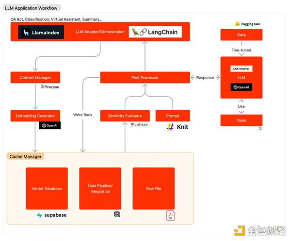 下图概述了 LLM 应用在回应用户查询时的流程:首先,相关的数据源被转换为嵌入向量并存储在向量数据库中。LLM 适配器使用用户查询和相似性搜索从向量数据库中找到相关的上下文。相关的上下文被放入 Prompt 中并发送给 LLM 。LLM 将执行这些 Prompt,并使用工具生成回答。有时,LLM 会在特定数据集上进行调优,以提高准确性并降低成本。
