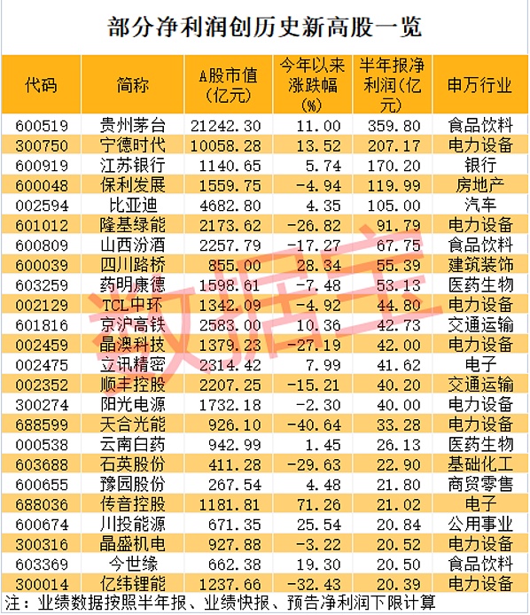 贵州茅台、宁德时代、江苏银行、保利发展、比亚迪上半年净利润超百亿元。贵州茅台半年报显示,公司上半年实现净利润359.8亿元,同比增长20.76%;与第一季度相比,公司净利润环比减少26.97%。照此计算,上半年该公司日盈利达到1.99亿元。二季度末,该公司持仓机构达到1620家,机构持仓占流通股比例为76.96%。