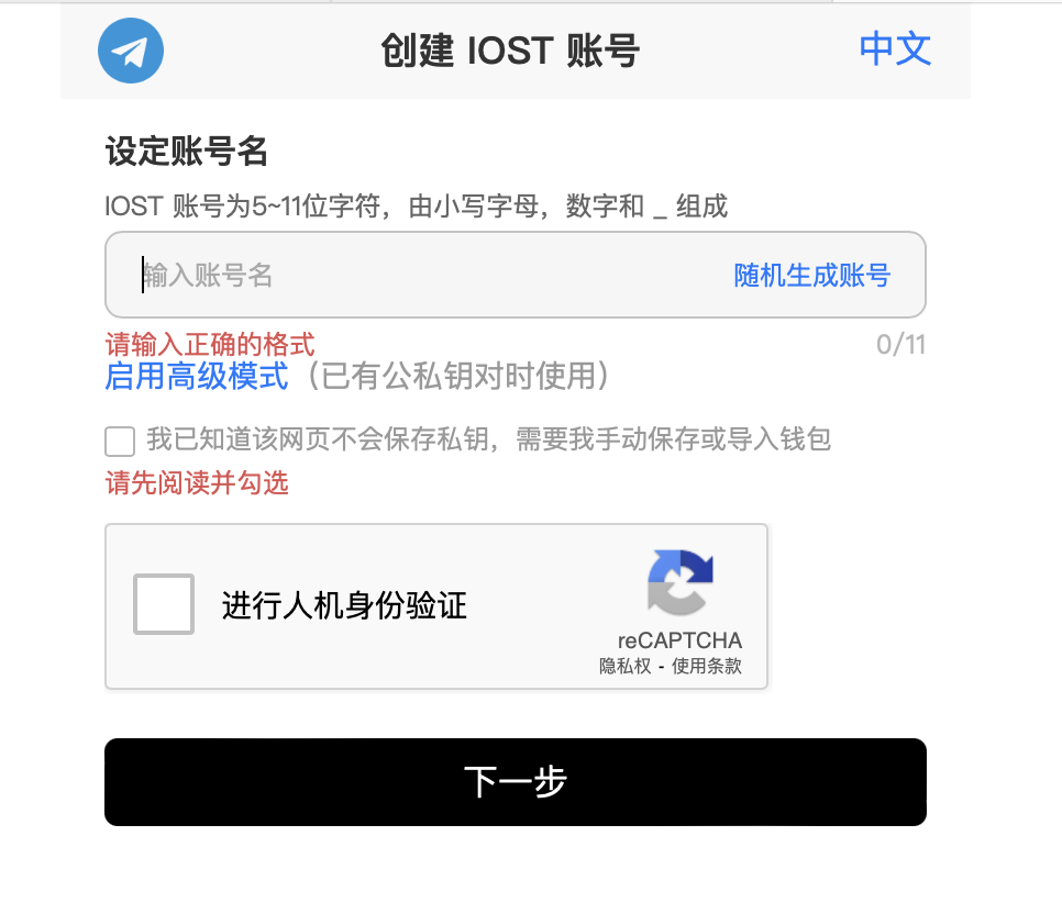 打开 IOST 账号创建网页:https://iostaccount.io/create ,用户可设定 5~11 位字符的账号名,也可以点击“随机生成账号”随机生成账号名。之后需勾选 “我已知道该网页不会保存私钥,需要我手动保存或导入钱包”。