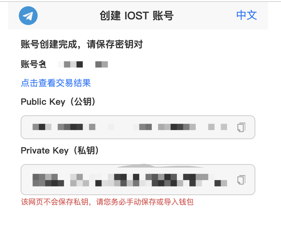 完成人机身份验证后,点击“下一步”,IOST 账号即可创建完成。用户可看到账号名、公钥、私钥,同时需要妥善保管并备份私钥,之后便可通过私钥登录 iWallet Pro、TokenPocket、BitKeep、Citadel 等支持 IOST 底层的钱包。