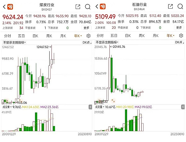 虽然当前全球各国都掀起了新能源热,但传统能源依然尤其一席之地。除了上述天然气板块外,近些年煤炭板块和石油板块也十分强势。煤炭板块年K线已5连阳,累计涨幅达122.37%。石油板块年K线则是3连阳,累计涨幅为46.02%。