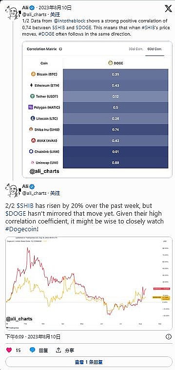 目前,狗狗币尚未复制 SHIB 中观察到的价格轨迹。截至发稿,meme 币交易价格为 0.07554 美元,日涨幅为 0.24%,周涨幅为 1.80%。尽管如此,加密货币分析师 Ali Martinez 表示,密切关注狗狗币可能是明智之举,因为它与 SHIB 具有强大的相关系数。