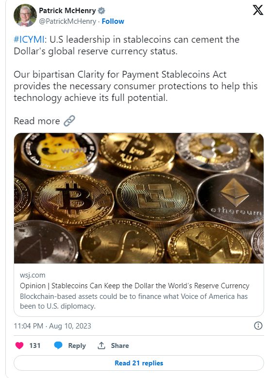 众议院金融服务委员会主席帕特里克·麦克亨利(Patrick McHenry)在7月提出了《稳定币清晰法案》(Clarity for Stablecoins Act),但该立法在国会缺乏两党支持。