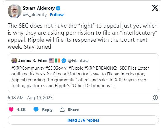 美国证券交易委员会试图证明法院的裁决,即瑞波币在加密交易所的程序化XRP报价和个人销售不是证券。