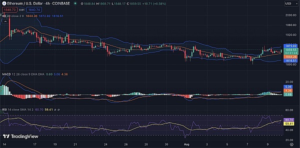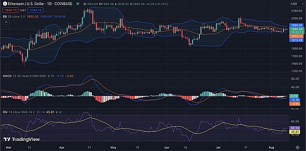 技术分析显示,ETH/USD 可能很快就会形成看跌趋势,因为预计未来几个小时内会有更多抛售压力。布林带似乎受到挤压,这可能表明任一方向都有突破。目前布林线上限为 1,890 美元,下限为 1,819 美元。ETH/USD 的 MACD 显示市场处于看跌趋势,MACD 指标穿越信号线下方。ETH/美元的相对强弱指数(RSI)目前为 50.14,表明该加密货币是中性的,并且可能在未来几个小时内出现小幅反弹。