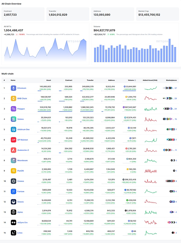 8 月 13 日,根据 NFTScan 多链数据统计显示,以太坊、BNBChain、Polygon、Solana、Arbitrum、Optimism 等在内的 16 条主流区块链网络上,已经累计发行了 10 亿枚 NFT 资产,部署了超过 265 万个 NFT 资产合约。