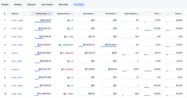 NFTScan 对排名前 1000 的 NFT 持仓价值钱包地址进行了分析,当前持有价值排名前 10 如下图所示: