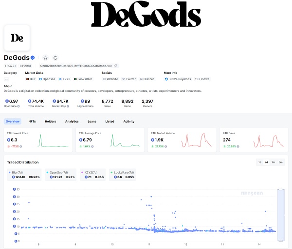 8 月 11 日,一地址于凌晨在 Blur 上抛售约 200 枚 DeGods NFT,目前 Blur 上 DeGods 地板价降至 6.71 ETH,OpenSea 数据显示,两日前 DeGods 地板价为 9.4 ETH。