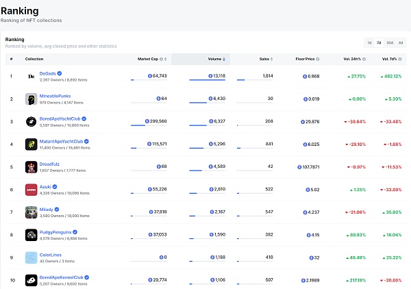 本周 DeGods 位列第一,目前地板价在 6.968e 左右有一定降低,7d 交易额为 13,118e;BoredApeYachtClub 以 6,327e 的交易额位列第三,目前地板价为 29.87e;Azuki上周交易额为 2,810e,地板价在 5.02e 左右。市场情绪降低,蓝筹整体市场交易额及地板价目前较为平稳。