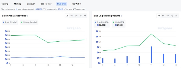 当前 19 只蓝筹合约总市值为 1,454,853 ETH,占NFT 总市值的 25.01%。