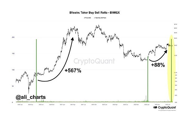 此外,首席加密货币分析师阿里·马丁内斯(Ali Martinez)也对近期市场走势发表了看法。马丁内斯在周六的推文中强调了 BitMEX 购买量突然增加与比特币随后价格走势之间的历史关系。该分析师表示,近期 BitMEX 买卖比率的增加增加了比特币牛市持续的可能性。阿里·马丁内斯表示: