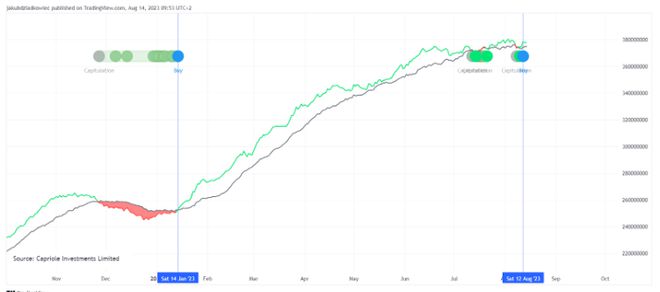 此前,该指标于 2023 年 1 月 14 日产生了蓝色信号。本周末,确切地说是 8 月 12 日,算力丝带今年第二次变成蓝色。