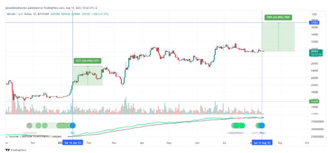 上一次,信号出现后,BTC价格上涨了约27%:从20,000美元的水平上涨到25,300美元的峰值。如果现在重复同样的情况,BTC 可能会在未来几周内达到 37,300 美元的水平。