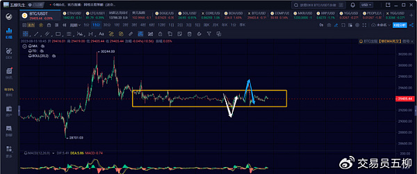 1h级别,这里震荡了两个中枢,当然因为价格有重合,所以并不是一个两中枢的上涨趋势。只能说是两个箱体的震荡。短线这里先看看能否再冲一笔反弹去一下29800~30000附近。不管能不能冲一波,后续都是看一笔绿色箭头的下跌,即下一笔4h级别的下跌破28000的,耐心等待吧。