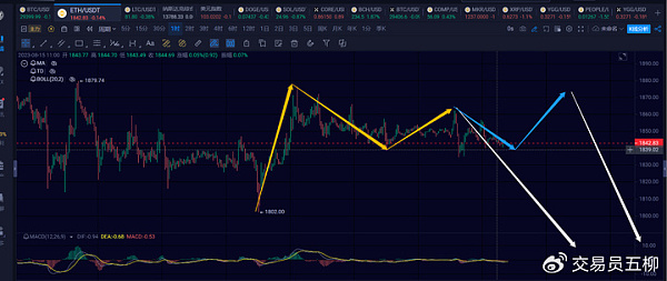 以太的4h级别的反弹已经初步成型了,第三笔黄色箭头那(即1862附近)就可以走一笔4小时中枢离开段的一笔4h级别的下跌。当然情况复杂一点的话,再冲一笔1h级别的反弹去1870附近,如上图蓝色箭头那样,结构会更完美一点。但不管怎样,后续继续看新一笔4h级别的下跌。短线上方压力1880,1900。下方支撑1830,1800。