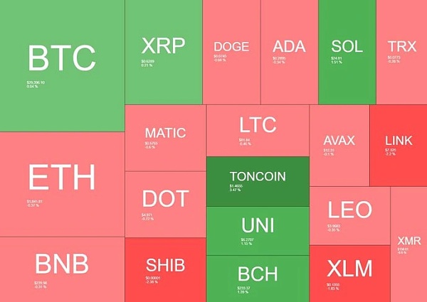 正如下面的热图所示,大多数较大的加密货币未能出现任何大幅上涨,并且当天交易接近持平。