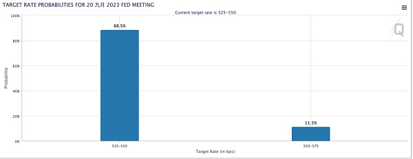 至于9 月升息机率有多少?芝商所FedWatch 工具显示,市场普遍预测9 月暂停升息的机率为88.5%,升息一码的机率为11.5%。