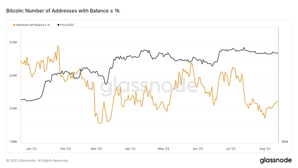 Glassnode 的数据也显示,截至美国时间8 月13 日,比特币余额至少超过1,000 枚的钱包地址总数为2,015 个,确实比8 月初多了10 个。
