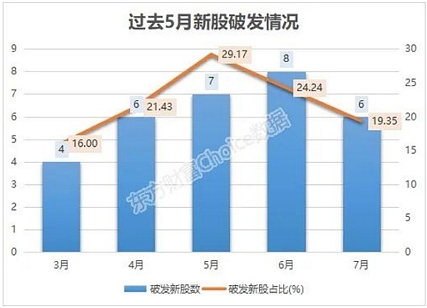 而过去几个月新股破发的概率还是很高的。统计发现,自今年3月出现新股首日破发后,至7月的5个月时间,合计有31股首日破发,占期间上市新股总量的22%。