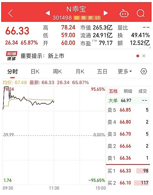 N乖宝招股说明书显示,公司主要从事犬用和猫用宠物食品的研发、生产和销售。根据早盘收盘价计算,N乖宝最新总市值达到265.35亿元,上市首日即刷新A股宠物经济股市值纪录。