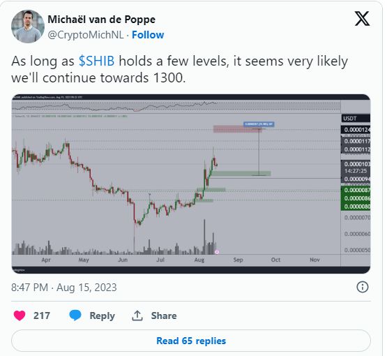 Van de Poppe 在微博平台 X(以前称为 Twitter)上与他的 660,000 多名粉丝分享的一条推文中表示,假设某些关键支撑位保持不变,SHIB 可能会继续以每枚代币 0.000013 美元的价格进行交易,高于其当前水平为 0.0000096 美元。