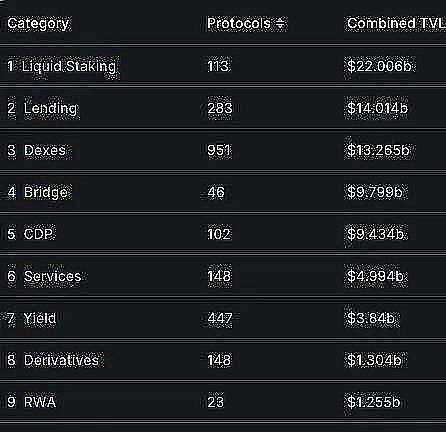 RWA的兴起也推动了RWA TVL(总锁仓价值)的增长。根据Defillama的数据,RWA赛道的TVL已经提升至第9位。