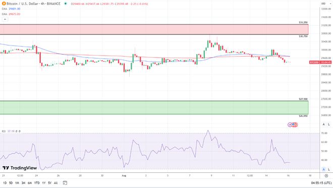 14-4小时RSI读数为37.19,反映出看跌情绪,卖压超过买压。值得注意的是,RSI与EMA一致,使28500美元以下和27500至26850美元的支撑区间进入视野。