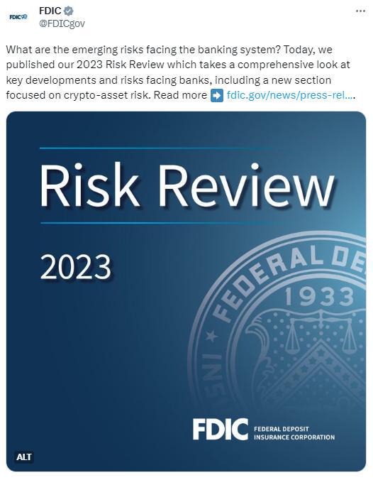 尽管一路来到8月,新一轮的爆雷潮并未实际发生,但值得注意的是,根据美国FDIC周初发布的2023年度美国银行体系风险评估报告,首次将加密货币纳入这份报告中,并将其风险独立出一个章节,定位为5大重要风险之一。