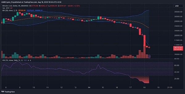 这种趋势之所以成为趋势的原因之一可能与 BTC 的技术状态有关。截至发稿时,随着波动性的增加,四小时图上相对强弱指数 (RSI) 触及 7.01。