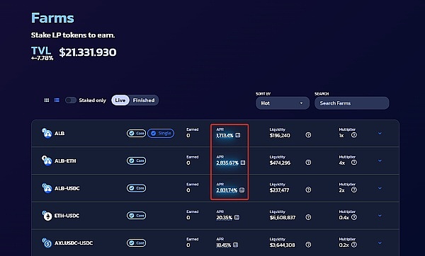 如果单纯的以高收益为投资导向,可以考虑ALB的单币质押或者LP质押,但是往往高收益代表着高风险,如此之高的收益如果协议本身无法快速的实现盈利的正向飞轮,那么这种高收益或许都只是诱饵,最终都有可能进入死亡螺旋或者直接RUG,这就需要投资者自己评估其抗风险能力。