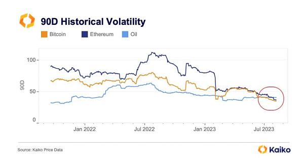 加密货币分析公司 Kaiko 的数据显示,比特币和以太坊的 90 天波动率已分别降至 35% 和 37%。这是自 2016 年以来顶级代币的最低波动率,甚至低于当前石油等大宗商品的波动率(41%)。
