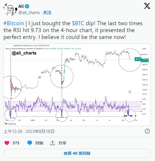 截至发稿,比特币 (BTC) 价格下跌 7.83%,至 26,394 美元,市值为 5,130 亿美元。对于长期投资者来说,这可能是一个充实自己的好机会。受欢迎的加密货币投资者 Ali Martinez 解释说,比特币 RSI 在 4 小时图表上已触及 9.43 水平。上次 BTC 价格触及这些 RSI 水平时,出现了强劲反弹。