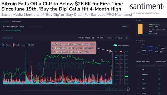 链上数据显示,近期比特币价格调整导致逢低买入的呼声激增。根据链上数据提供商 Santiment 的数据,比特币“逢低买入”的呼声在 8 月 17 日星期四触及四个月高点。