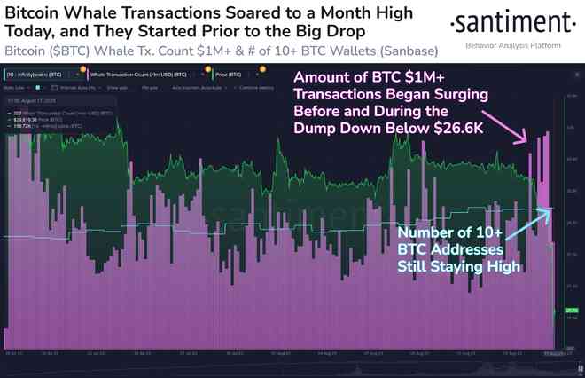 Santiment 数据还显示,鲸鱼在最近的垃圾场上非常活跃。最近加密货币市场价格暴跌的后果仍远未解决,这是 2023 年最严重的跌幅之一。 100 万美元以上的 BTC 交易量显着激增,表明鲸鱼积极参与了这次下跌。然而,桑蒂门特指出,大钱包的数量似乎并没有减少。
