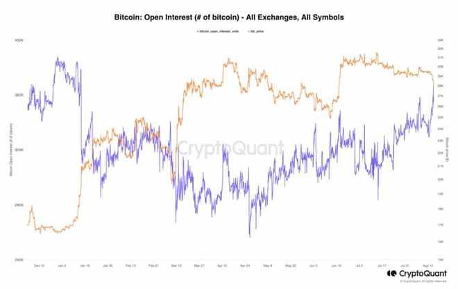 加密货币分析平台 CryptoQuant 在最新的 BTC 市场展望中表示,期货市场的未平仓头寸“至少自 7 月中旬以来就显示出空头头寸的积累”。换句话说,即使价格从 32,000 美元下跌,未平仓合约仍在增长。