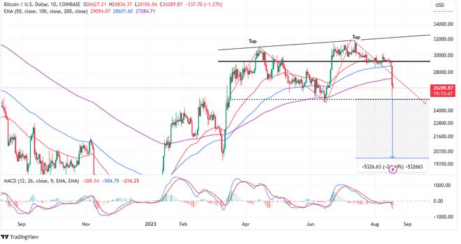 周五亚洲交易时段,比特币价格继续遭遇抛售,24 小时内下跌近 8%,至 26,362 美元。最著名的加密货币已经突破了 29,000 美元至 30,000 美元之间的区间通道,并测试了略高于 25,000 美元的水平。在下跌过程中,BTC价格可能会验证双顶形态,并导致跌幅低于20,000美元,然后再出现大幅反弹。
