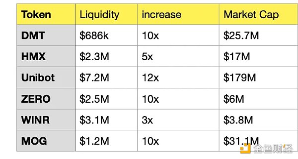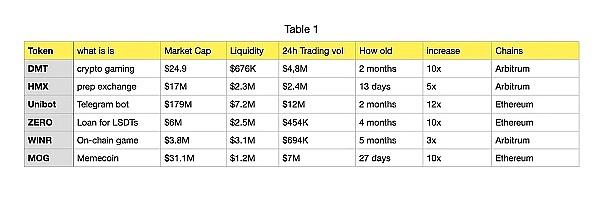 资本效率最高的是 $DMT 和 $MOG,两者都以最小的流动性实现了 10 倍的价格上涨。