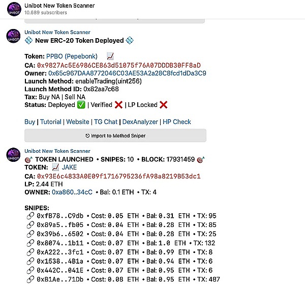 相反,Unibot 的真正吸引力在于模因币交易功能。有了它,你可以获得新代币发布的提醒,并能够在上市后立即购买代币。对于链上交易者来说,这当然是很好的用户体验,也是为什么“冲土狗”(变相的赌博)会让人着迷的原因。