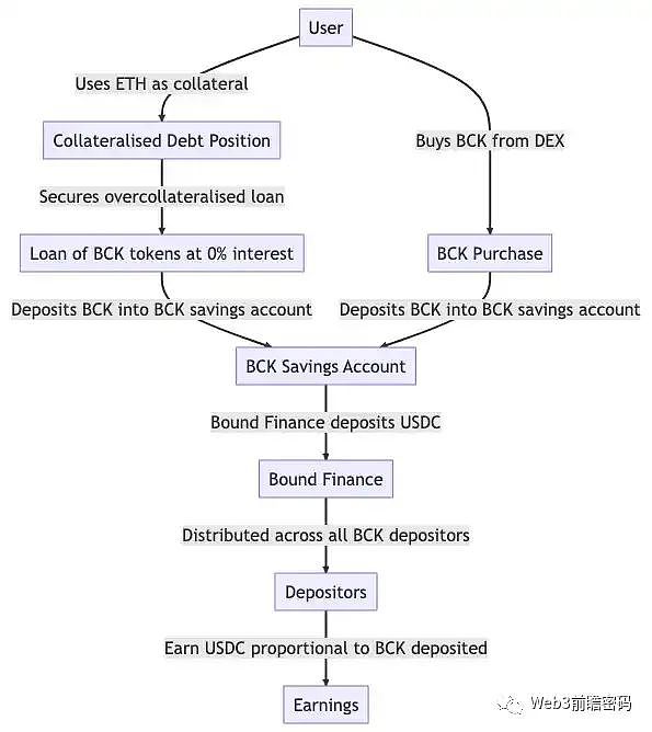 2.收益:与传统金融不同,Bound Finance不会对BCK贷款收取利息,而是通过让用户通过债务抵押头寸(CDP)中的抵押品赚取利息。收益来自于ETH的质押奖励。