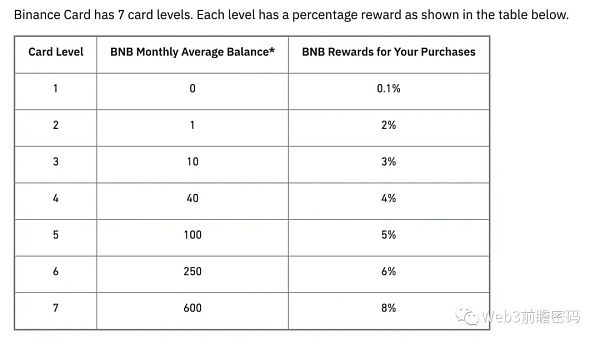 传统金融卡的现金返还率通常较低,并对用户的消费方式有限制,不是每个品牌消费都能享受现金返还。而加密卡的现金返还门槛较高,例如Binance要求持有至少600个BNB才能获得最高8%的现金返还,这需要长期持有大量的BNB,但BNB价格波动较大,对持有者影响较大,对普通散户来说,持有600个BNB已经是一笔巨额资产。
