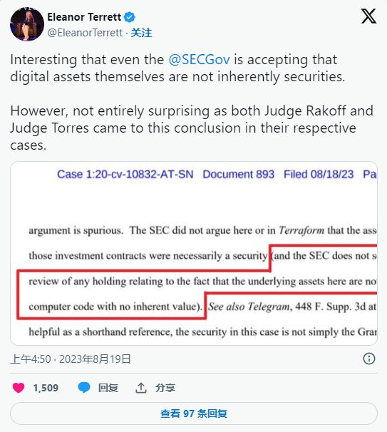 文件指出:“美国证券交易委员会不会寻求对任何与此相关的资产进行上诉审查,因为这里的基础资产只不过是没有内在价值的计算机代码。”