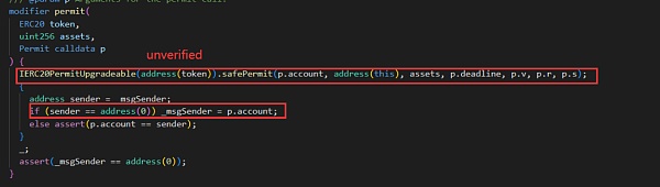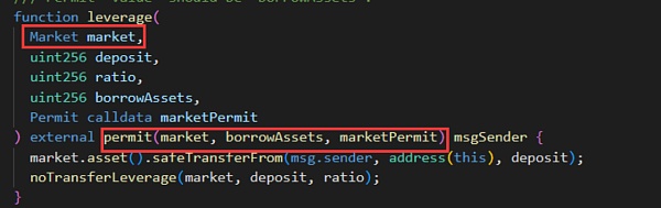 本次攻击利用了DebtManager(0x675d410d)合约中的漏洞,其中的leverage函数未校验传入market参数是否为可信的市场合约,导致在permit函数修饰器中可将状态变量_msgSender修改为攻击者任意的传参地址。