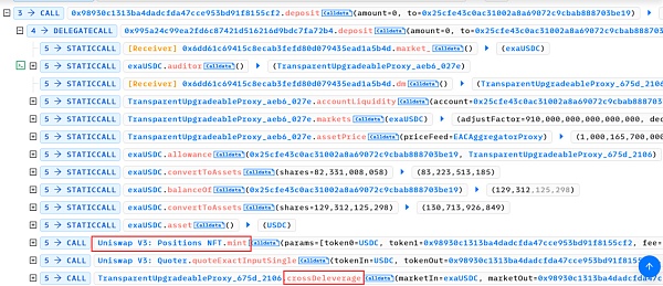 (3)在leverage函数中通过deposit函数到pool合约中添加USDC和恶意市场代币的流动性并重入到被攻击合约(0x675d410d)的crossDeleverage函数