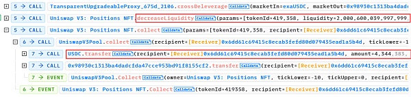 (4)在crossDeleverage函数中被攻击合约(0x675d410d)会使用USDC到pool合约中兑换恶意市场代币。