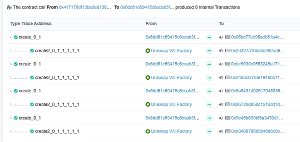 (1)攻击者(0x417179df)先通过攻击合约(0x6dd61c69)创建了多个恶意市场代币合约和多个uniswapPool合约。