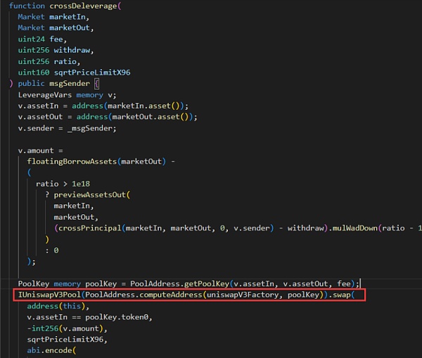 (2)随后调用被攻击合约(0x675d410d)的leverage函数并传入一个恶意市场代币地址。